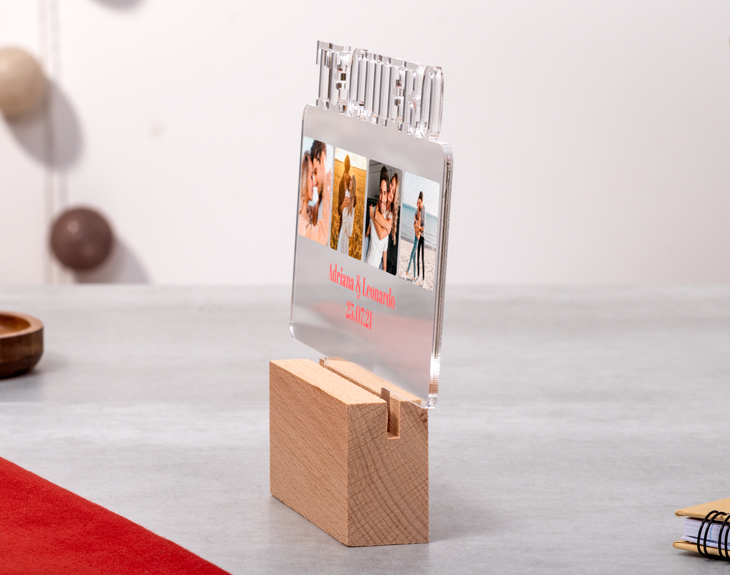 Nuestra lámpara está fabricada en metacrilato transparente sobre el que se talla la palabra “Te quiero” que corona el regalo. En la superficie del metacrilato, irán impresas vuestras 4 mejores fotografías y el texto que quieras dedicarle a tu pareja. Para dar luz al conjunto, podrás escoger entre tres tipos de bases: negra con luces de colores, madera con luz amarilla y madera grabada, en la que grabaremos a láser el texto que nos pidas.