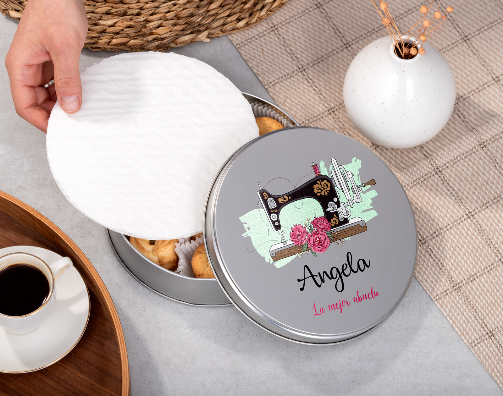 ¿Quién no ha ido alguna vez a casa de su abuela y se ha zampado una caja casi entera de galletas? Esto era una de las mejores cosas de visitar a la yaya los domingos: comer y de poster una buen ración de galletas. Para todas esas abuelas que siempre reutilizan la caja como costurero contamos con esta lata de galletas personalizada. ¡Podrá guardar todas sus agujas e hilos en su interior! Estas galletas de mantequilla son el mejor acompañamiento para una buena taza de café o té. Por eso esta lata de galletas con diseño para abuelas es perfecta para sorprender a la mejor costurera que conoces. Su diámetro es de 19 centímetros y una altura de 6,5 centímetros. Hay galletas de diferentes formas... ¡E incluso algunas con chocolate! Cuenta con dos vinilos que irán pegados, tanto en el lomo como en la tapa. Sabemos perfectamente cómo va a terminar este regalo original para abuelas, por eso queremos que este diseño sea tan especial como cuqui. A la hora de personalizar este diseño para las abus más costureras, solo tendrás que añadir el producto al carrito y entrar en el diseñador. ¡Ahí podrás personalizar tanto la tapa como el lateral de la caja! Escribe el nombre de la mejor abuela en la tapa, y luego podrás escribir el texto que quieras en el lateral. ¡Será la mejor sorpresa para ella! Diámetro: 19 cm. Peso: 227g aprox.