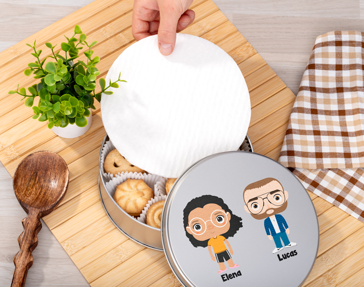 No hay capricho más delicioso en el mundo que una galleta de mantequilla, ¡cuándo abrimos la lata no podemos parar! Si quieres tener un detallito con un ser querido, con nuestra lata de galletas personalizada Tinok seguro que darás en el clavo. ¡Sobre todo si es tan goloso como nosotros! Diséñalo con las personas de su familia en versión Tinok y, cuando se las coma todas, le quedará un recuerdo de lo más emotivo. Nuestra lata se personaliza en total con dos vinilos adheridos en su tapa y en el lateral de la caja. En el vinilo del lateral escribiremos el texto que nos indiques, y sean los nombres de los destinatarios, una fecha especial o una frase emotiva/divertida. En la portada de la caja, irán colocados los personajes Tinok que escojas durante el diseño. Para tus personajes tienes un montón de opciones entre las que escoger. Cuentas con un catálogo de personajes ya predefinidos entre los que elegir y, si no encuentras el tuyo, siempre puedes optar por diseñar tu propio personaje desde cero con nuestro creador de avatares. Para completar su personalización, puedes anotar el nombre de cada persona debajo de su Tinok correspondiente y nosotros imprimiremos el resultado con los mismos personajes y el mismo orden en el vinilo que decorará la tapa de tu caja de galletas. La caja estará llena de deliciosas galletas de mantequilla que te harán la boca agua y, encima, se combinan con un diseño único y especial. No existe regalo más original que esta divertida caja para felicitar un cumpleaños o sorprender a un amigo o familiar cuando le hacemos una visita. Te lo pasarás genial diseñándola y los destinatarios alucinarán cuando la vean, al fin y al cabo, ¿quién no se ha intentado imaginar alguna vez cómo se vería si fuese un muñeco Tinok? Diámetro: 19 cm. Peso: 277 g aprox.