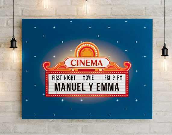 El sabor añejo de los viejos cines queda 100% reflejado en este lienzo personalizado. Para amores de película, de esos que no dejan de brillar, este es un regalo muy original. • Los laterales quedan envueltos con el propio lienzo. • Bastidor de 3cm de madera samba. • Tintas con protección para rayos UV. • Se entrega montado, listo para colgar.