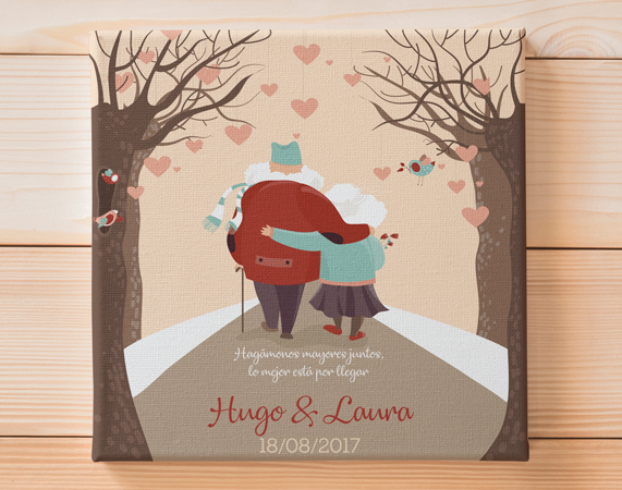 El lienzo personalizado perfecto para recordar a tu pareja que quieres estar siempre a su lado, que la vida juntos es lo mejor que hay y que no hay nada que pueda separaros. Un regalo muy original y tierno para emocionar a esa personita tan especial. Solo necesitamos vuestros nombres y esa fecha que marcó un antes y un después en vuestras vidas y haremos el lienzo más precioso del mundo. ¡Le encantará! • Los laterales quedan envueltos con el propio lienzo. • Bastidor de 3cm de madera samba. • Tintas con protección para rayos UV. • Se entrega montado, listo para colgar