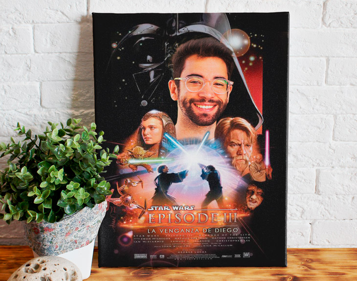 George Lucas tardó 3 películas en convertir al joven Anakin Skywalker en el señor del Lado Oscuro. Sin embargo, nosotros en tan solo un clic podemos convertirte en el protagonista de esta trágica historia de amor y ciencia ficción. Lo único que tienes que hacer es añadir al carrito este lienzo personalizado con el póster de cine del Episodio 3. ¡Y ya no será 'La Venganza de los Sith'! Ahora tendrá el subtítulo que tú elijas. Siéntete como un directivo de Lucasfilm y personaliza este regalo original para los más cinéfilos. Dinos el texto que quieres grabar y añade tu mejor foto. Tal cual la añadas, la recortaremos para que seas tú el que aparezca junto al casco de Darth Vader y entre Obi-Wan y Padme. La fuerza es tan intensa en este cartel de película con tu foto y tu nombre que no solo podrás escoger uno sino hasta 3 tamaños distintos. ¡Uno por cada episodio de la trilogía precuela! Recomendaciones para tu foto: -La imagen deberá ser lo más clara y nítida posible con bastante luz, ya que se recortará exactamente de la que se adjunte. -La persona no deberá aparecer muy alejada, con una altura mínima de medio cuerpo (este es el tamaño con el que aparecerá en el producto). -Recomendamos que aparezca la persona sobre un fondo lo más uniforme posible, y sin agarrarse a otras personas. Que se le vean todas las facciones del medio cuerpo. • Los laterales quedan envueltos con el propio lienzo. • Bastidor de 3cm de madera samba. • Tintas con protección para rayos UV. • Se entrega montado, listo para colgar.