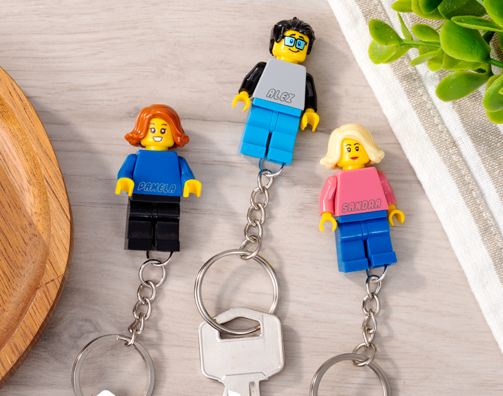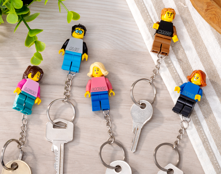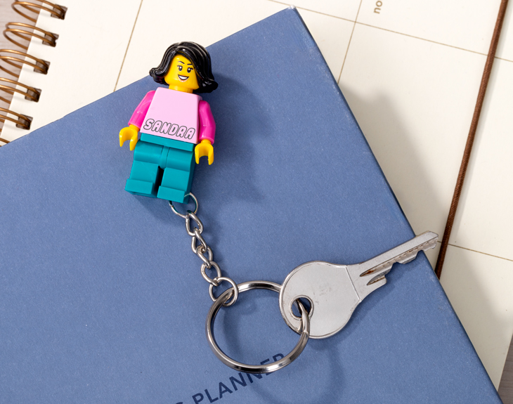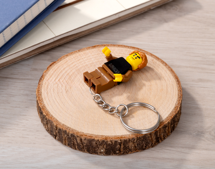 • Llavero minifigura Lego. • Tarjeta recordatoria.