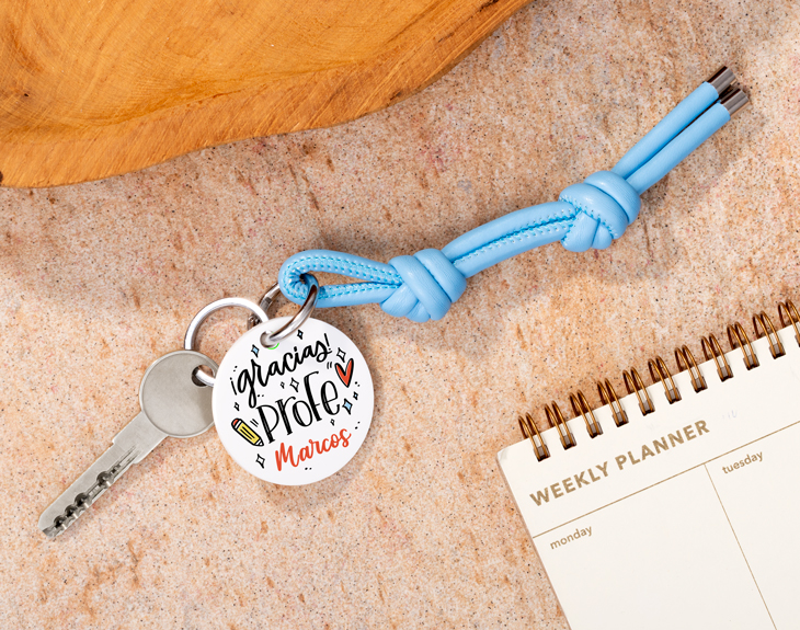 Este llavero personalizado de metacrilato es mucho más que un llavero. Es un “Gracias, profe” lleno de magia y cariño. Porque ser profe es regalar tiempo, paciencia y amor. Y si tu peque ha tenido un profe así, este detalle hará que su esfuerzo nunca se olvide. Con su cuerda de nudo, este llavero añade un toque de estilo y hace que encontrar las llaves sea muy sencillo. Además, está disponible en colores súper chulos para que puedas elegir el que mejor encaje con su personalidad. Personalizarlo es muy fácil. Solo tienes que añadirlo al carrito, entrar en el área de personalización y poner el nombre del profe. Nosotros nos encargamos de que quede perfecto y listo para emocionar. Regala un recuerdo único el último día de clase. Porque el mejor profe merece un regalo original y lleno de cariño. ¡Este llavero se convertirá en su accesorio para llaves favorito!