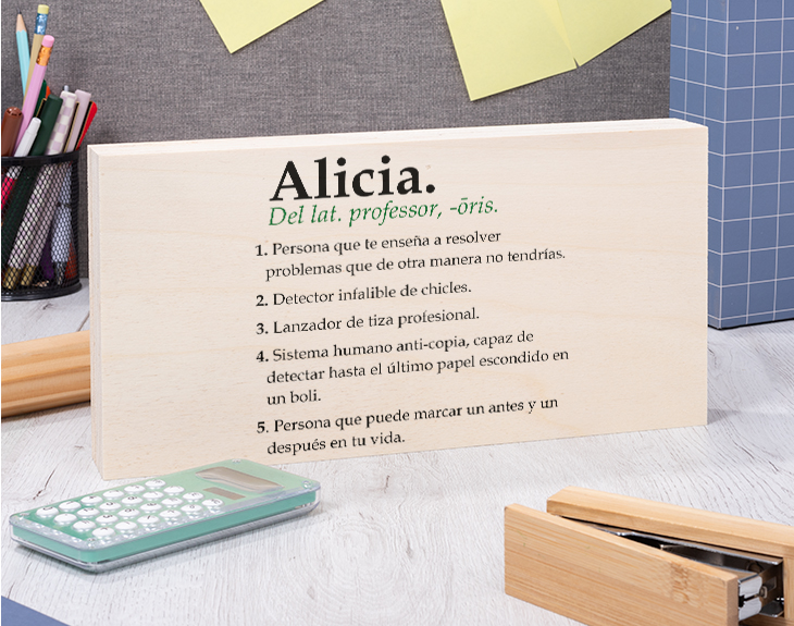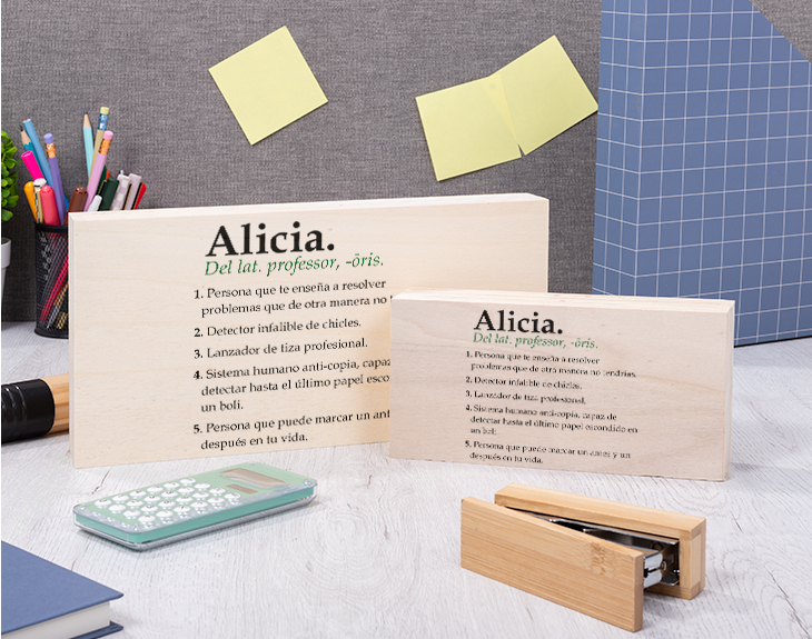 Aprovecha el final de curso para sorprender a tu profe favorito o favorita con esta madera personalizada. Si tu profe es un detector de chicles infalible, la persona con más precisión del mundo lanzando tizas o el sistema anticopia más avanzado que existe, esta madera personalizada es el regalo perfecto. Solamente nos tendrás que decir su nombre y nosotros lo añadiremos a este divertido diseño. Seguro que le hace mucha ilusión este detalle tan especial y las risas no faltarán. ¿No te parece una idea genial? Importante: Las maderas tienen vetas y estas quedan reflejadas en la imagen. Tenemos dos tamaños disponibles: - 20 x 10 x 4,2 cm. - 30 x 15 x 4,2 cm