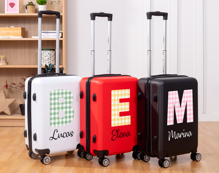 En ocasiones viajar nos genera mucho estrés y nerviosismo. Y si vamos con prisas, podemos cometer algún pequeño fallo, como coger una maleta que no es la nuestra, debido a que queremos ir a mil por hora. Con esta maleta personalizada eso se terminará, olvídate de llevarte una maleta que no es la tuya por confusión. Lo más especial que tiene este producto y lo que lo diferencia de las demás, es que esta maleta es personalizable. Podrás escribir tu inicial en grande y debajo poner tu nombre. La inicial está rellena con un estampado vichy súper bonito. Esta maleta también será un regalo muy especial para esa persona aventurera que adora viajar y recorrer el mundo. El tamaño de esta maleta es de 55x35x20 centímetros aproximadamente y las ruedas giran 360º. Tiene distintos compartimentos que hacen que se pueda aprovechar al máximo el espacio. Gracias a este producto, viajar será muchísimo más cómodo y práctico. ¡no esperes más y hazte con esta maleta tan chula! Para personalizarla, lo primero es añadirla al carrito y entrar al área de personalización. Solo queda escribir tu nombre con la inicial y nosotros nos encargamos de todo lo demás.