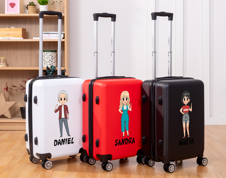 ¿Las vacaciones de verano siempre están reservadas para disfrutarlas con tu familia? ¿Ya habéis pensado en el viaje de este año? Es el momento perfecto para que llegue a casa con una sorpresa enorme: esta maleta personalizada con una familia Anime adorable. Solo tendrás que elegir los personajes que quieras y ponerles nombre. ¿No es el mejor regalo del mundo para una familia como la tuya? Anímate y empieza a personalizar la maleta de viaje de este año. Además, tiene una distribución perfecta con distintos compartimentos para que pueda aprovechar el espacio al máximo. Asimismo, las ruedas giran 360º lo que la convierte en una maleta muy cómoda y práctica. Importante: nuestro equipo de personalización se encargará de ajustar la distribución de los personajes en el producto en función de su tamaño para que se vean lo mejor posible. Especificaciones: • Maleta de cabina: 55cm x 35 cm x 20 cm - Disponible en rojo y negro • Maleta mediana: 67cm x 42cm x 23 cm - Disponible en blanco • Maleta grande: 74cm x 47cm x 29 cm - Disponible en blanco