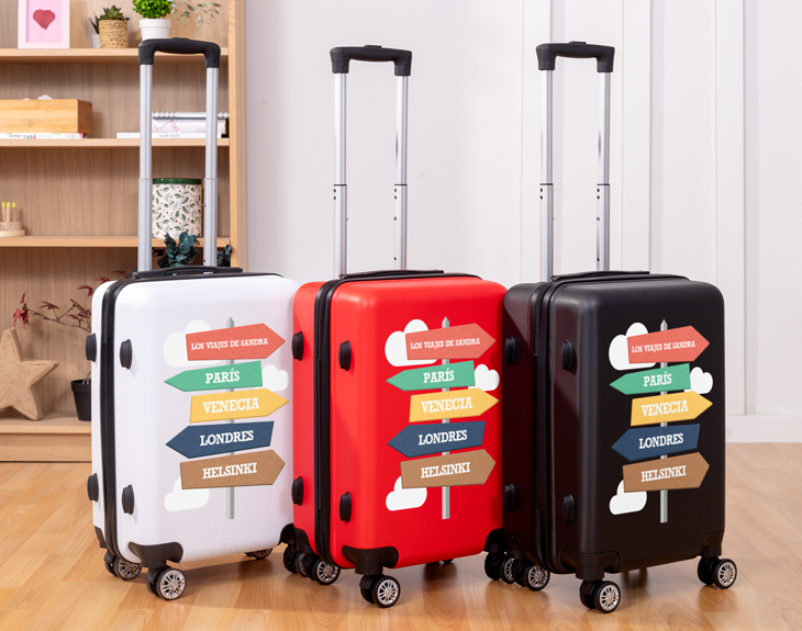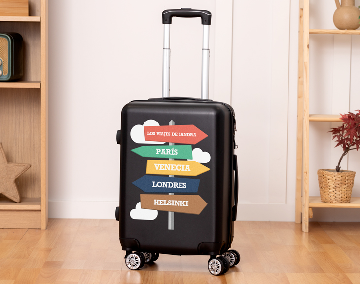 Piensa en las ciudades que siempre has querido estar, o en aquellas a las que siempre querrás volver. Qué mejor manera de hacer esos viajes que con esos destinos increíbles inscritos en tu propia maleta personalizada con Flechas de Destinos. Este regalo original es el perfecto complemento para ti o para regalar a alguien con quien quieres hacer esos viajes. ¡Puedes personalizar la maleta con los nombres que tú quieras! Además de este fantástico diseño, la maleta personalizada es muy cómoda de llevar gracias a sus dos tipos de agarre con los que arrastrarás fácilmente las cuatro ruedas con giro de 360º. Ya sea que vayas por el aeropuerto o por la calle, ¡presume de comodidad y diseño! Podrás elegir entre los colores blanco marfil, negro y rojo. El interior de la maleta está formado por varios compartimentos para llevar bien separada y sujeta tu ropa: una parte con asas y la otra con cremallera y un bolsillo adicional bien ancho. Al tener dimensiones de maleta de mano, puedes llevar la maleta contigo en el avión en la mayoría de las aerolíneas (easyJet, Iberia, Vueling y muchas otras). Medidas: 55 x 35 x 20 aproximadamente.