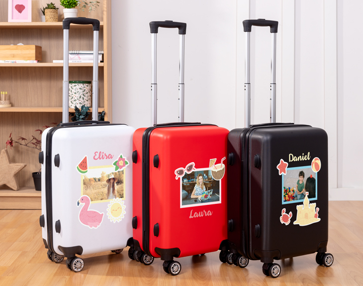 El primer paso es firmar tu maleta: puedes escribir tu nombre, tu mote, el nombre de la ciudad a la que vas o cualquier breve texto que defina tu viaje. Lo segundo es personalizar la cubierta externa de esta maleta de mano con una fotografía impresa a color: puede ser el paisaje de destino, un selfie de la persona con la que vas o la mejor imagen de vuestras pasadas vacaciones. ¡Porque es hora de mejorar ese recuerdo! Y por último, puedes acompañar este diseño con varios marcos veraniegos muy coloridos y divertidos con todos los elementos que te transportan a un paraíso ideal.