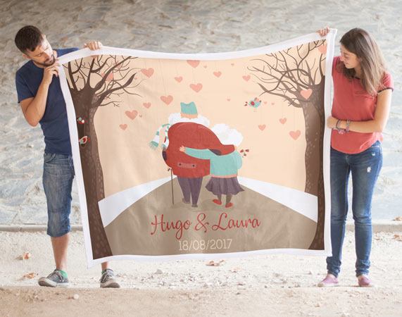 Envejecer junto a la persona que amas es el regalo más bonito de la vida, y ahora tú puedes insinuarle a tu pareja que quieres hacerlo con ella. Regálale esta manta tan tierna con los ancianos agarrados y llenos de amor y sorpréndele en el momento más insospechado. ¿A quién no le gustaría envejecer rodeador de ternura y mucho amor? Solo tienes que darnos vuestros nombres y el texto o la fecha que quieras para la parte inferior y tendrás esta manta para acurrucarte con tu pareja hasta envejecer. ¡Qué dulce! Las medidas pueden variar unos centímetros, son aproximadas.