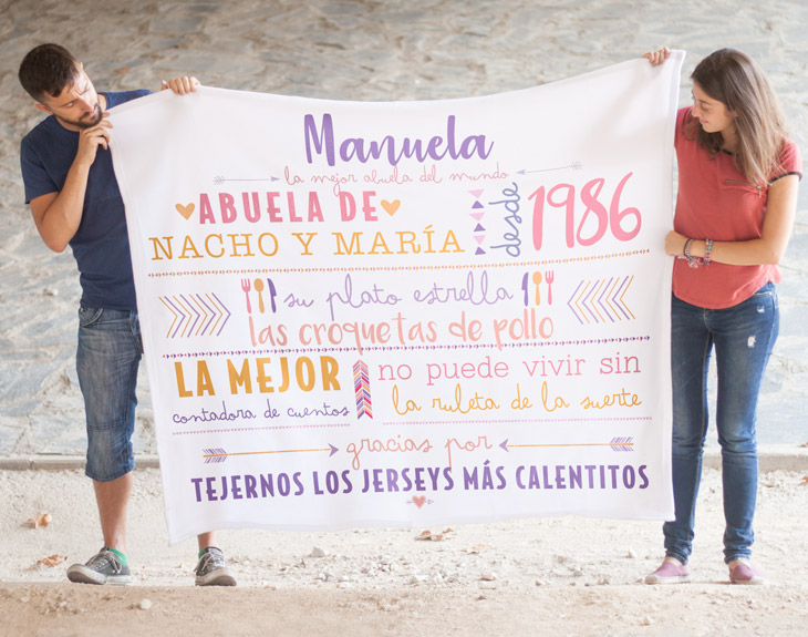 ¡Qué especiales son esos momentos en el sofá con tu abuela, de la mano, viendo cualquier telenovela o serie! Seguro que, cuando no estás con ella, te echa muchísimo de menos ahí a su lado. Hazla sentirse bien acompañada y abrigada de tu cariño con esta manta personalizada. Añádela al carrito y mira en la previsualización lo bonito que queda tu diseño completamente personalizado. Lo mejor de este regalo original para abuelas es que no solo podrás escribir su nombre. ¡Dile todo lo especial que tiene y tanto echas de menos! Su plato que siempre quieres probar, aquello sin lo que no puede vivir... y, por supuesto, vuestros nombres, los de sus queridos nietos/as. Todo ello lo tendrá impreso a color y al gran tamaño de 170 centímetros de ancho. Además de poder elegir todas las frases de nuestra plantilla de historia, podrás escoger entre la manta polar o de coralina. ¡Para que nunca pase frío! Las medidas pueden variar unos centímetros, son aproximadas.