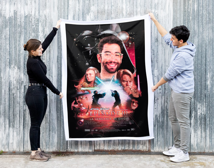 Cuando piensas en Darth Vader, seguro que no te lo imaginas sin su larga capa negra. ¡Es lo que le da identidad! Si tú también quieres dominar la galaxia y no tienes capa ni casco, no te puede faltar esta meteórica manta personalizada. En ella, reemplazarás a Hayden Christensen ocupando el lugar del mismísimo Anakin Skywalker. ¡Podrás estar junto a Obi-Wan y Padme! La fuerza es intensa en nuestro equipo, así que lo único que tienes que hacer es enviarnos tu mejor foto con tu cara épica de póster de película y el subtítulo que quieras. ¡Siéntete como George Lucas y reescribe el subtítulo de 'La Venganza de los Sith'! Podrás escribir el texto que quieras para que pueda ser un fantástico regalo original para los cinéfilos. La próxima vez que veas toda la saga Star Wars de principio a fin no te puede faltar esta manta personalizada con el cartel de cine con tu foto y nombre. ¡Que la fuerza y el calorcito de la manta te acompañe! Recomendaciones para tu foto: -La imagen deberá ser lo más clara y nítida posible con bastante luz, ya que se recortará exactamente de la que se adjunte. -La persona no deberá aparecer muy alejada, con una altura mínima de medio cuerpo (este es el tamaño con el que aparecerá en el producto). -Recomendamos que aparezca la persona sobre un fondo lo más uniforme posible, y sin agarrarse a otras personas. Que se le vean todas las facciones del medio cuerpo. Las medidas pueden variar unos centímetros, son aproximadas.