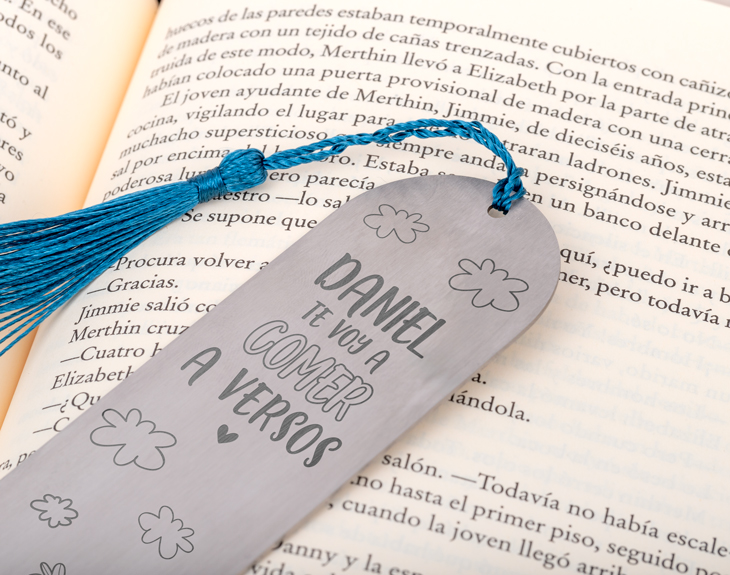Se acerca Sant Jordi, la ocasión perfecta para disfrutar con tus seres queridos de vuestro amor por la lectura y de muchas rosas. Porque a pesar de que en este día se suele regalar un libro y una rosa, nosotros estamos seguros de que a esa persona que es amante de los libros, hay un regalo que le haría mucha ilusión recibir y es su propio marcapáginas personalizado. Además, si conoces la leyenda de esta festividad, el diseño que hemos creado te va a robar el corazón. Sant Jordi, la princesa, el dragón, la rosa... Cuenta la leyenda que el caballero Sant Jordi salvó a una princesa de morir bajo las garras de un dragón y que de su sangre floreció una rosa roja que el caballero le regaló a la princesa. Es el momento de tener un original marcapáginas de metal con esta increíble historia grabada en él. Y es que nadie tendrá un marcapáginas igual a este. Para poder personalizar este marcapáginas, primero debes entrar en el área de personalización. Después, nosotros te dejamos este precioso diseño para que tú solo tengas que escribir el nombre que quieras y ajustarlo para que quede perfecto. ¡Será el mejor regalo para Sant Jordi! Medidas aproximadas: 15 x 4 cm. Material: aluminio. Importante: en el extremo incluye una pequeña borla de hilo. Podrás elegir el color que más te guste: gris, negro, azul, rosa o marrón clarito.