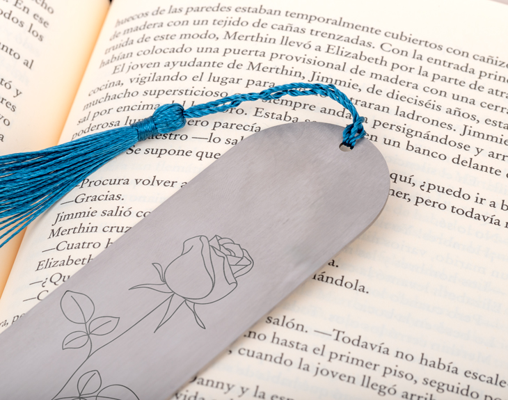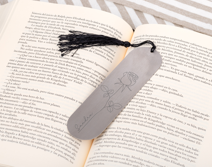 ¡Atentos todos los amantes de los libros, tenemos el regalo perfecto para vosotros! Un marcapáginas personalizado con un diseño inspirado en el día más bonito del año: Sant Jordi. Y es que esta mítica fecha es el momento del año donde podemos (y debemos) regalar un libro y una rosa a esa persona que tanto queremos, porque sí, porque se lo merece. Pero si quieres innovar un poco, este marcapáginas es lo más. Que sí, que está muy bien regalar un libro y una rosa pero este año queremos ir un paso más allá y añadir algo nuevo a esta tradición. Por eso, este original marcapáginas será el detalle que se robe todas las miradas en esta ocasión tan especial. Además, su diseño no podía ser otro que una rosa, símbolo típico de esta festvidad y que queda genial con el aluminio, material del que está hecho este marcapáginas. Pero lo más importante de todo, es que no te puedes olvidar de personalizar este marcapáginas para convertirlo en un regalo único. Entra en nuestro diseñador, donde primero podrá elegir el color de la borda que incluye este marcapáginas y después solo tienes que escribir el nombre de la persona que tú quieras. Sencillo y muy rápido. ¡Será el mejor regalo del mundo! Medidas aproximadas: 15 x 4 cm. Material: aluminio. Importante: en el extremo incluye una pequeña borla de hilo. Podrás elegir el color que más te guste: gris, negro, azul, rosa o marrón clarito.