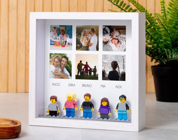 • Marco blanco de madera 20cm x 20cm x 5cm con minifiguras Lego. • Tarjeta recordatoria.