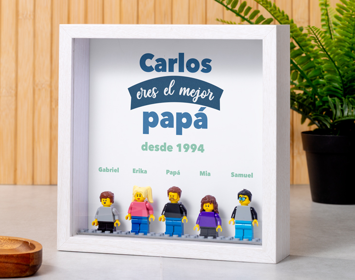 ¿Quién es esa persona que siempre está tanto en lo bueno como en lo malo? ¿Que siempre te apoya y te ayuda en todo lo que necesitas? Si para ti esa persona es tu papá, está claro que tienes que darle las gracias con un regalo a su altura. Si se acerca alguna fecha especial como su cumpleaños, el Día del Padre o un amigo invisible, tenemos el detalle perfecto que le puedes hacer. Se trata de nuestro marco con minifiguras lego con diseño "Mejor Papá". ¡Le encantará! Y es que si cuando eras pequeño te pasabas las tardes enteras jugando con tu papá con las famosas piezas Lego, está es la mejor de agradecerle por esos buenos momentos. Con nuestro marco, podrás crear a estas minifiguras como tú quieras. ¡Seguro que consigues que os representen a todos tus familiares, ¡tendrás a tu propia familia Lego! Por último, te explicamos como diseñar a estas minifiguras. El primer paso a seguir consiste en entrar en nuestro diseñador. Una vez ahí, ya puedes elegir las características de tu figura Lego y nosotros nos encargamos de montar las piezas para crear a una familia de Legos igualitos a vosotros. Pronto estarán perfectos y listos para regalar. ¡Será un original regalo para fans de Lego! Medidas marco: 20cm x 20cm x 5cm. Medidas figuras Lego: 4cm de alto. Importante: este producto contiene una pequeña ranura en la parte superior. En el caso de que una pieza no esté disponible, se sustituirá por otra similar.