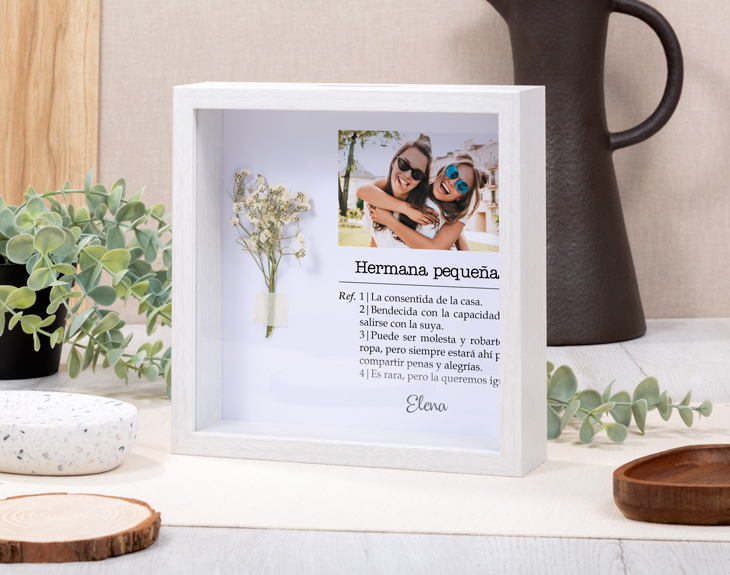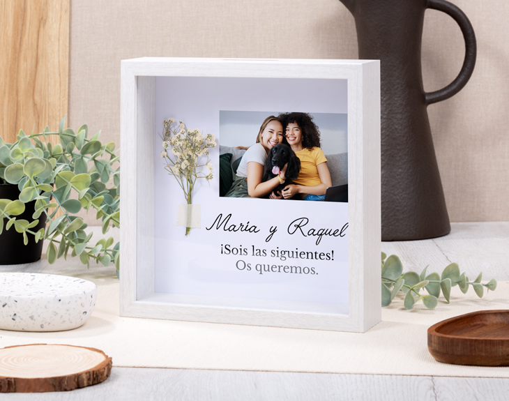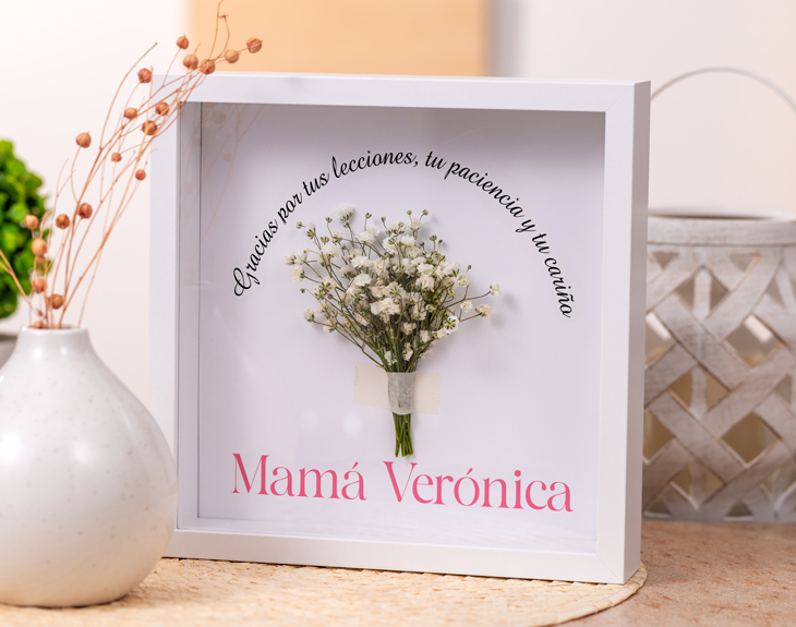 Seguro que estás en ese momento en el que te toca sorprender a alguien muy especial en una fecha importante. Deja de buscar el regalo perfecto porque lo tenemos nosotros y es este marco de madera personalizado. Sin duda es un detalle único que nadie más va a tener y que además podrás personalizar totalmente a tu gusto. Y es que este adorno quedará genial en cualquier rinconcito de casa. ¡Es lo más! No importa si se acerca un cumpleaños, tu aniversario, el amigo invisible o cualquier otro evento, porque con este original regalo triunfarás seguro. Lo mejor es que podrás crear este marco como tú quieras, porque todo el texto que ves en la imagen es editable, así que te toca escribir lo que quieres que esa persona nunca olvide. ¡Le encantará! Para personalizar este marco de madera, el primer paso es añadir el producto al carrito. Después, entrarás en nuestro diseñador y ahí ya podrás escribir el mensaje que quieras y que quedará ideal junto a este ramito de flores. Nosotros nos encargamos de que quede perfecto y listo para regalar. Importante: este producto contiene una pequeña ranura en la parte superior. Medidas marco: 20 cm x 20 cm x 5 cm.