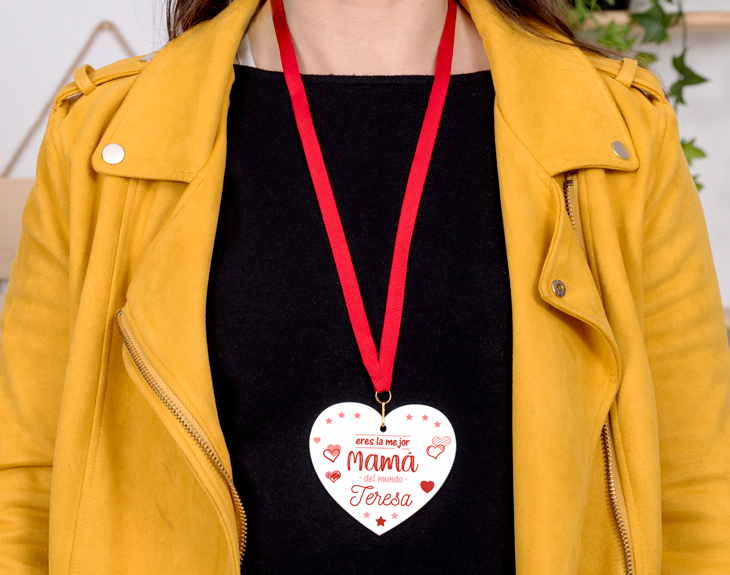 Mamá siempre ha sido la persona que lo ha dado todo por ti. ¿Cuántas veces te ha cuidado y mimado a lo largo de todos estos años? Ha llegado el momento de recompensarla de una forma original por todo lo que ha hecho por ti. Esta medalla de metacrilato personalizada será el premio a toda una vida que estaba esperando. ¡Una medalla en forma de corazón con un diseño hecho exclusivamente para ella! Mamá ha puesto todo su corazón en su familia y sobre todo en sus hijos. ¿Por qué no recompensarla con esta medalla de metacrilato con forma de corazón y diseño de mamá? Al estar hecha de metacrilato y contar con una cuerda de color rojo, podrás colgársela para que la lleve con orgullo a cualquier parte. Cuenta con unas medidas de 8,5 centímetros de alto y 9,5 centímetros de largo. ¡Un detalle para la mejor mamá! ¡Regálale el corazón más bonito a mamá! Este regalo original para el Día de la Madre es perfecto para que tu madre se quede con la boca abierta. Podrás personalizarla en el interior del área de personalización, donde encontrarás la plantilla del diseño en forma de corazón. ¡Clica sobre el cuadro de texto para escribir el nombre que quieras! Altura: 8,5 centímetros. Longitud: 9,5 centímetros. Material: metacrilato.