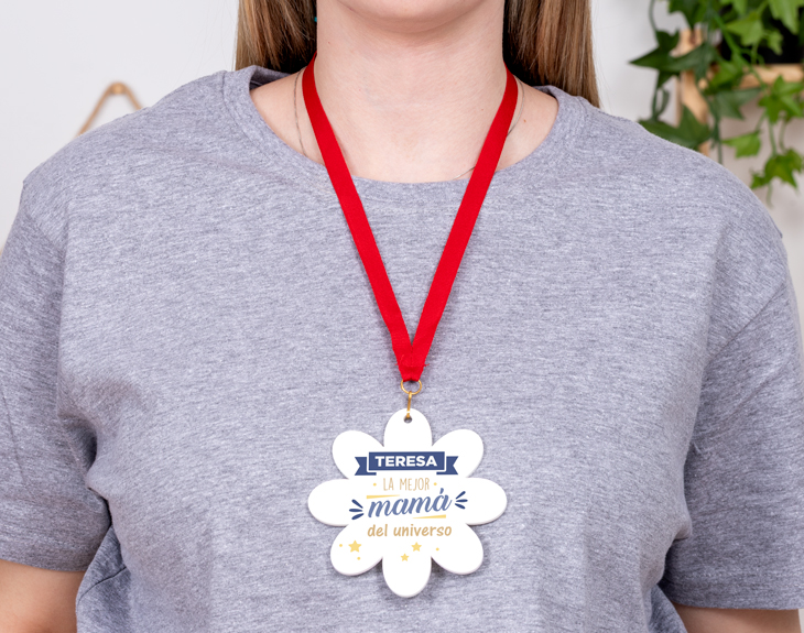 En el universo podemos encontrar madres de todos los tipos, pero ninguna de ellas es como la que ha estado contigo toda la vida: la tuya. Una madre como la tuya no es de lo más común, por lo que hay que recompensarla de la mejor forma posible: esta medalla de metacrilato personalizada está pensada exclusivamente para ella. ¡Será su mayor premio! Como sabemos que una madre como la tuya no se puede comparar con ninguna otra del universo, esta medalla de metacrilato flor con diseño para mamá es toda suya. ¡Es el galardón que se merece por todos estos años de cariños y paciencia! Esta flor está hecha de metacrilato y cuenta con unas medidas de 10 centímetros, tanto en horizontal como en vertical. ¡Incluye una cuerda de color rojo para colgar la medalla del cuello! ¿Qué te parecería otorgarle el mejor premio que se le puede dar a una madre? ¡Nómbrala la mejor mamá del universo gracias a este regalo original para mamá! Esta flor será el mejor detalle que puedas tener con ella en este día tan especial. En el área de personalización encontrarás la plantilla de esta medalla tan cuqui, en la que podrás escribir su nombre sin problema. ¡Clica sobre el cuadro de texto para personalizar el diseño de la forma que quieras! Diámetro: 10 centímetros. Material: metacrilato.
