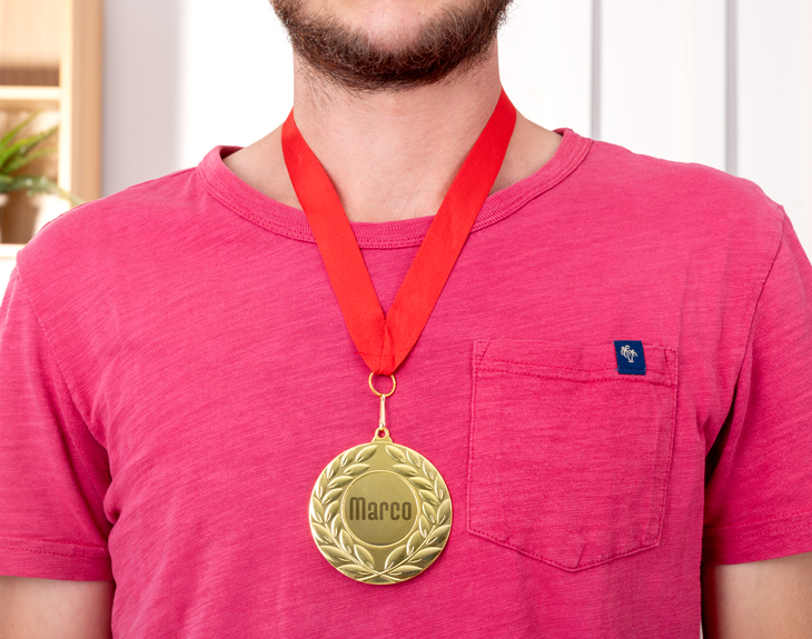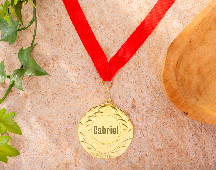 Cuando quieres premiar a alguien especial, esta medalla dorada grabada es la opción perfecta para reconocer su esfuerzo y dedicación. Con su elegante acabado dorado y la clásica corona de laurel, es el trofeo ideal para celebrar ese logro tan importante y hacer que se sienta verdaderamente apreciada y orgullosa de sus méritos. Y lo que la hace aún más especial es que puedes personalizarla grabando un nombre o un texto corto, creando así un premio original que hará que cualquier ceremonia, ya sea académica, escolar o corporativa, sea realmente inolvidable. Gracias a su cinta de poliéster roja y a su resistente anilla metálica, esta medalla personalizada es cómoda de llevar y se convierte en un homenaje único e irrepetible, perfecta como regalo de graduación. Para personalizarla, solo tienes que añadirla al carrito, escribir el nombre o texto que quieras y, en pocos minutos, tendrás el reconocimiento perfecto para sorprender y hacer llorar a más de uno. Material: metal. Peso: 70 gr. Dimensiones: -Alto: 50cm. -Diámetro: 7cm.