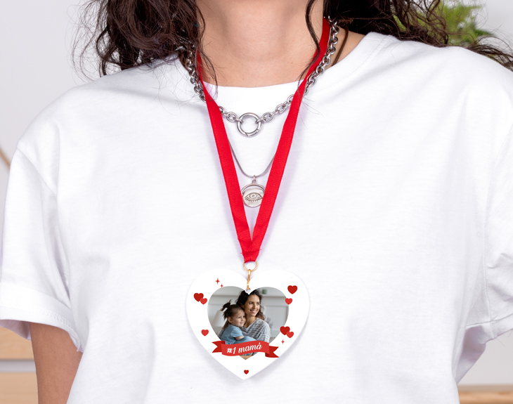 Sabemos que no hay ninguna madre que se pueda comparar con esa mujer que te dio la vida... ¡Y siempre es un buen momento para decírselo! Si crees que mamá es la número uno de todas las madres, esta medalla de metacrilato personalizada está hecha para ella. ¡Será todo un honor que la reciba de manos de su hijo/a! Podrá colgársela y contemplarla las veces que quiera. Y es que esta medalla de metacrilato con forma de corazón y diseño de mamá está hecha solo para aquellas madres que siempre están dispuestas a darlo todo por sus hijos. Esta medalla está hecha de metacrilato y cuenta con unas medidas de 8,5 x 9,5 centímetros, por lo que quedará de lujo colgada del cuello de mamá. ¡Será un premio por todo el cariño y el amor que nos ha dado a lo largo de su vida! Este producto resulta un regalo original perfecto por el Día de la Madre o para cualquier ocasión especial. Al entrar en el diseñador podrás personalizar la medalla de la forma que quieras, ya sea a nivel de color del diseño como a nivel de foto o texto. Añade el producto al carrito y entra en el diseñador para crear tu propio diseño para mamá, eligiendo tanto el color como la foto que quieres para el detalle. ¡Sube la imagen al clicar sobre el cuadro de foto! Altura: 8,5 centímetros. Longitud: 9,5 centímetros. Material: metacrilato.
