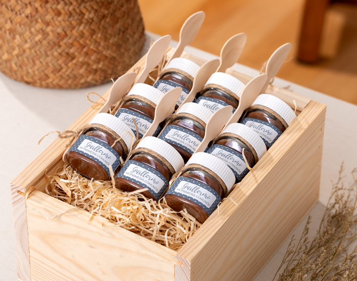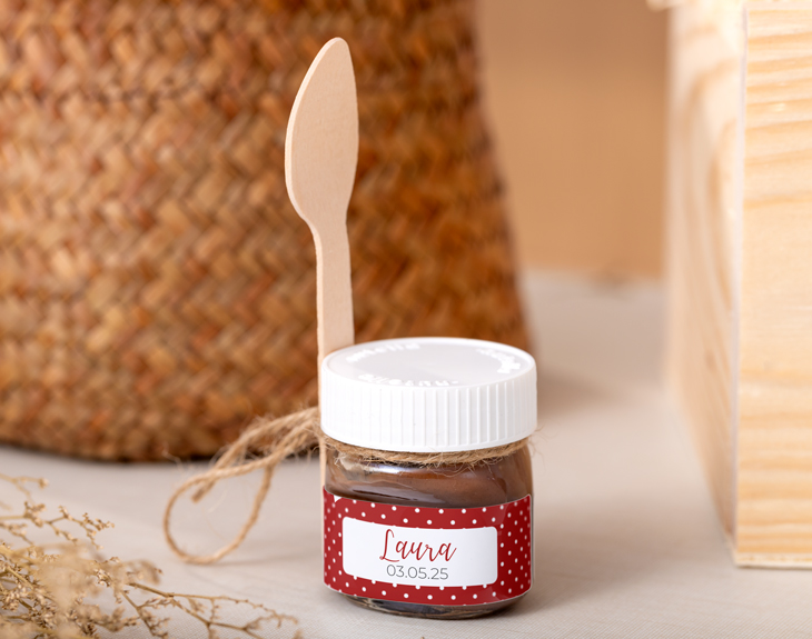 • Mini bote de Nutella 25gr personalizado. • Cuchara de madera. • Tarjeta Recordatoria.