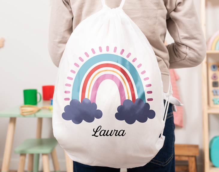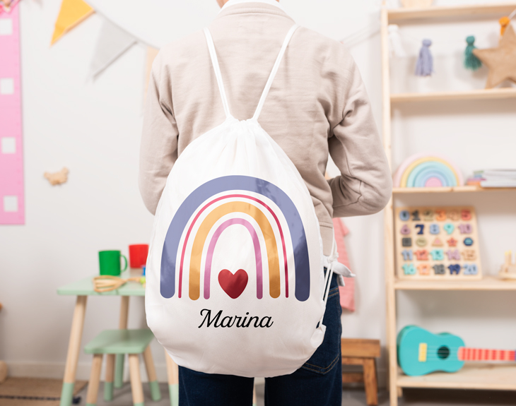 ¿Con la vuelta al cole, tu hijo se ha apuntado a mil clases extraescolares? Ahora que va a tener que pasar tanto tiempo fuera de casa es importante que siempre vaya bien preparado, para que no pase frío, hambre o sed. Por eso, esta mochila de cuerdas es algo que no puede faltar en su vuelta al cole. Es la mochila perfecta para que se la lleve a las actividades extraescolares, a las excursiones o para cuando vaya al parque a jugar con sus amigos. Puede guardar el bocadillo de la merienda, una botella de agua, una chaqueta por si al salir hace fresquito. Además, tiene un delicado diseño de un estampado de arcoíris chulísimo. ¡Llenará de color la nueva rutina del más pequeño de la casa! Y te preguntarás…¿Cómo se puede personalizar esta mochila? Es muy sencillo. Primero tienes que añadir el producto al carrito y acceder al área de personalización. Una vez ahí, solo tendrás que escribir el nombre que quieras y ya nosotros nos encargamos de plasmarlo en el diseño. Medidas: 34,5 cm x 41 cm. Material: suave poliéster 210T