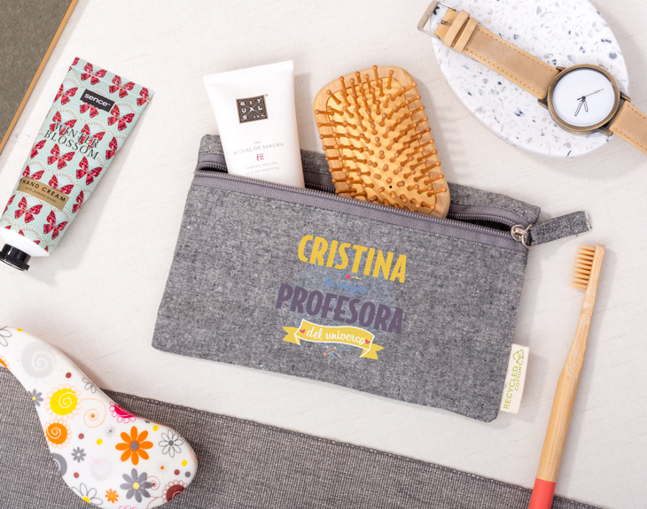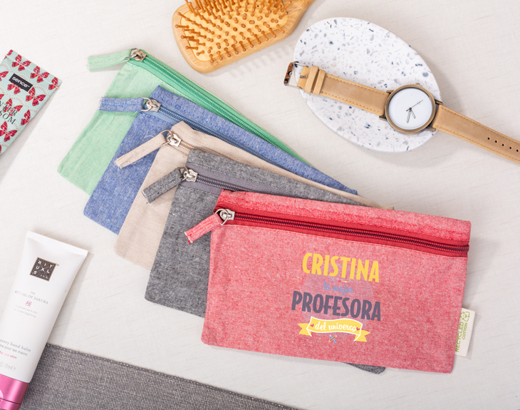 Las profes nos enseñan un montón y tienen muchísima paciencia con nosotros. Gracias a ellas se completa nuestra educación y aprendemos cosas nuevas que son super importantes para la vida. Si se acerca el final de curso o simplemente quieres tener un detalle con tu profe por ayudarte tanto este neceser de algodón personalizado le va a encantar. Nuestros neceseres están disponibles en 4 colores disponibles: verde, rojo, gris y beige. Y aparte de tener un diseño super chulo están hechos de algodón reciclado, de esta manera estarás ayudando al ecosistema, por lo tanto a tu profe le encantará aún más. Este regalo es super funcional: le servirá para llevar sus productos de higiene en el bolso o para usarlo como estuche y que el resto de alumnos puedan ver el regalo tan chulo que ha recibido. ¡Seguro que estará encantada de lucirlo! Material: algodón reciclado. Medidas: 21x12,5 cm.