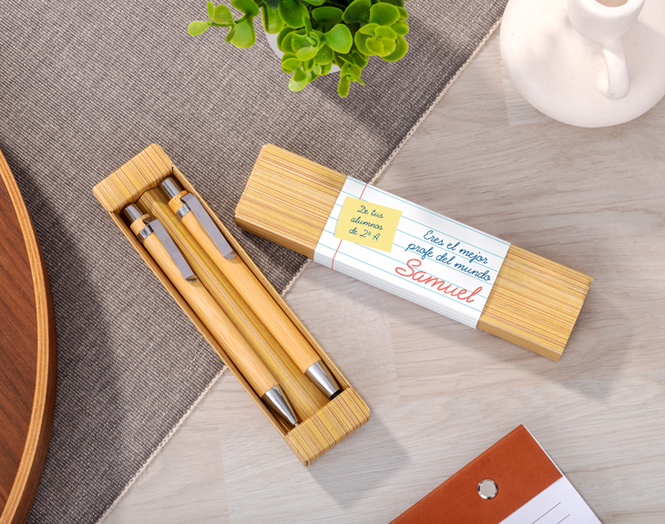 Si hay alguien que merece un detalle especial al final del curso, ¡ese es tu profe! Con el diseño “El cuaderno del profe”, tienes la oportunidad de sorprenderle con un regalo único, práctico y lleno de significado. Un homenaje perfecto para quien ha estado ahí cada día, enseñando, motivando y dando lo mejor de sí. Este bonito set incluye un bolígrafo y un portaminas de bambú, de gran calidad y con un diseño que simula la página de un cuaderno escolar. Lo mejor es que puedes personalizar la portada con el mensaje que tú elijas: una dedicatoria, el nombre del curso, o incluso una frase divertida que solo entendáis en clase. Personalizarlo es muy sencillo: añade el producto al carrito, entra en el área de personalización y escribe el texto que quieras. En solo unos clics tendrás listo un regalo original para profes, perfecto para cerrar el curso con una sonrisa.