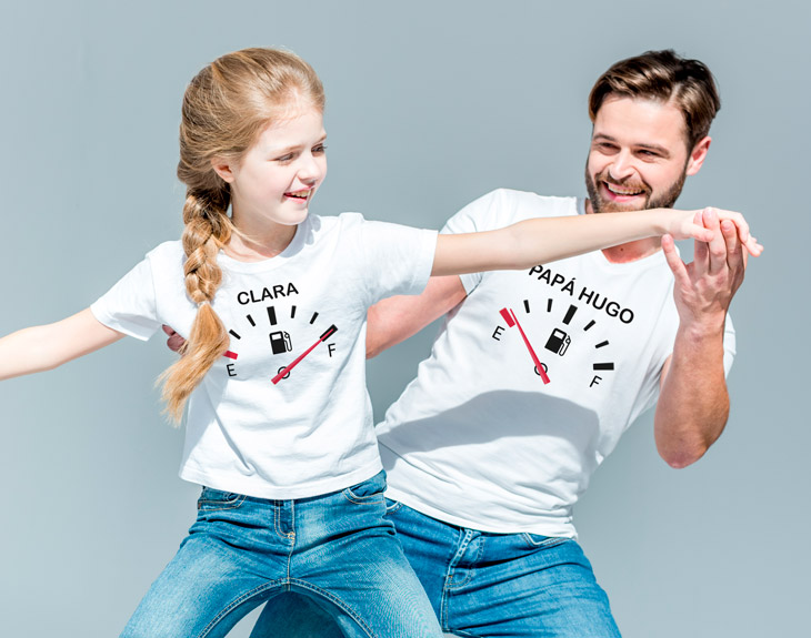 Tener hijos es maravilloso. Todo el mundo dice que es una alegría, que no hay nada más bonito que traer una nueva personita al mundo. Sin embargo, nadie te cuenta la parte mala de eso: el agotamiento. Criar un niño (o dos, o tres, o cuatro) puede ser de lo más agotador, y crearte un cansancio de lo más espantoso. ¿Quieres alegrar a papá y darle un chute de energía? Este pack de camisetas personalizadas hará que su fatigación desaparezca. ¿Cuántas noches se ha quedado sin dormir para poder cuidarte cuando más lo necesitabas? Seguro que, en más de una ocasión, ha antepuesto tu cuidado a su propio descanso y comodidad. ¡Puede que incluso agotases sus reservas de gasolina! Por eso este pack de camisetas es tan especial, un regalo perfecto para agradecerle a tu padre todo lo que ha hecho por ti a lo largo de los años. Este diseño está basado en un depósito de gasolina, haciendo referencia a las energías que tenéis ambos después de pasaros un día juntos. Añade vuestros nombres a este regalo original para el Día del padre. ¡Así podréis ir conjuntados todos los días! Importante: Las medidas son aproximadas, pueden variar 5cm por encima o por debajo.