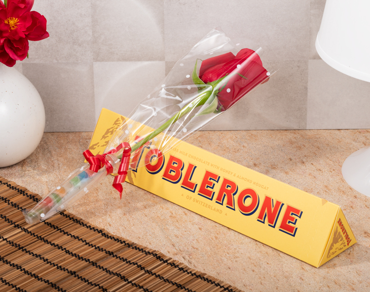 • Toblerone gigante (360g). • Rosa natural. • Tarjeta Recordatoria.