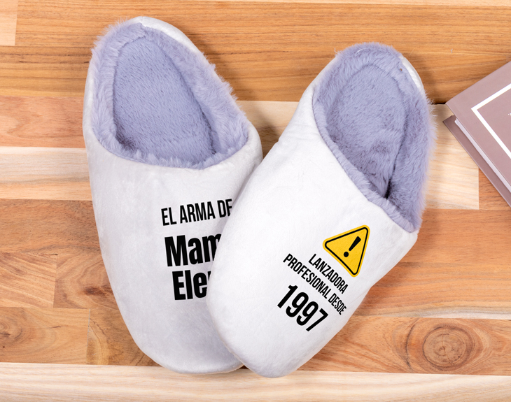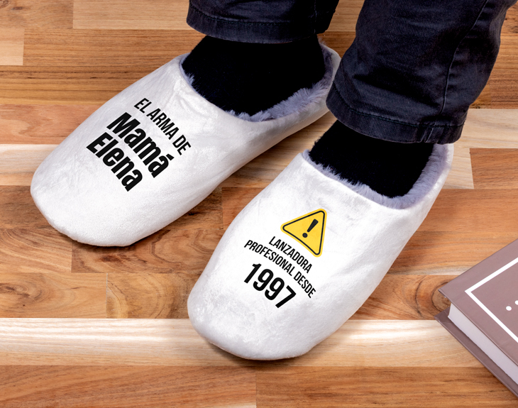 ¿Alguna vez te ha volado una chancla a la velocidad de la luz? Entonces sabes de lo que hablamos. Las madres tienen un talento especial que solo ellas dominan: puntería milimétrica, reflejos de ninja y una puntería que haría temblar a cualquier atleta olímpico. Pero tranquila, ¡este año no hace falta que esquives nada! Regálale a mamá unas pantuflas personalizadas que le recuerden con humor (y mucho cariño) ese superpoder legendario. En una leerá: “El arma de mamá” con su nombre, y en la otra: “Lanzadora profesional desde...” con el año en que empezó a ejercer el noble arte del lanzamiento justiciero. Además de divertidas, estas pantuflas son súper cómodas, calentitas y con un diseño minimalista que combina con cualquier momento de relax en casa. Perfectas para el Día de la Madre, su cumpleaños o simplemente para sorprenderla con regalo original. Personalizarlas es facilísimo: Añade las pantuflas al carrito, añade el nombre y el año, ¡y listo! Nosotros nos encargamos de que estén perfectas. Porque mamá se merece descansar... y seguir manteniendo la puntería, pero con estilo. Talla: 26 cm x 11,5 cm (36-38) Material: algodón/poliéster.