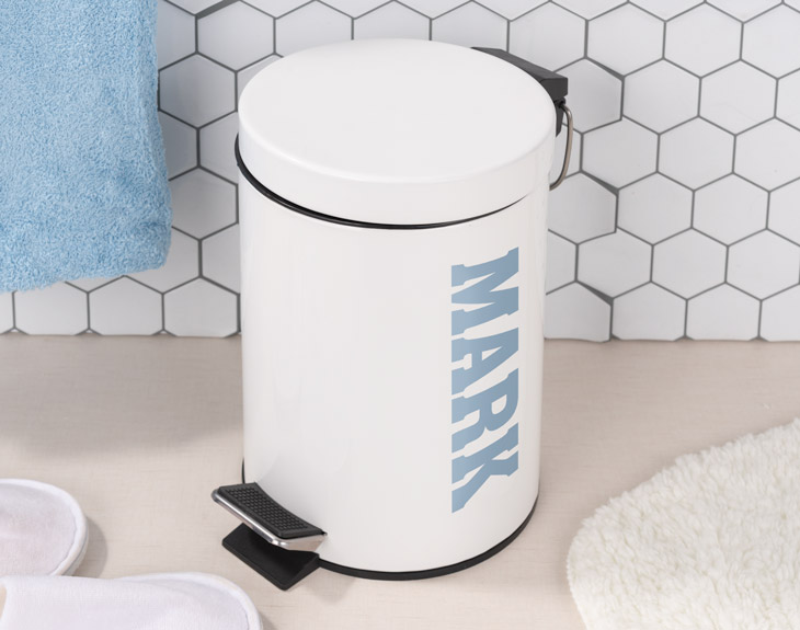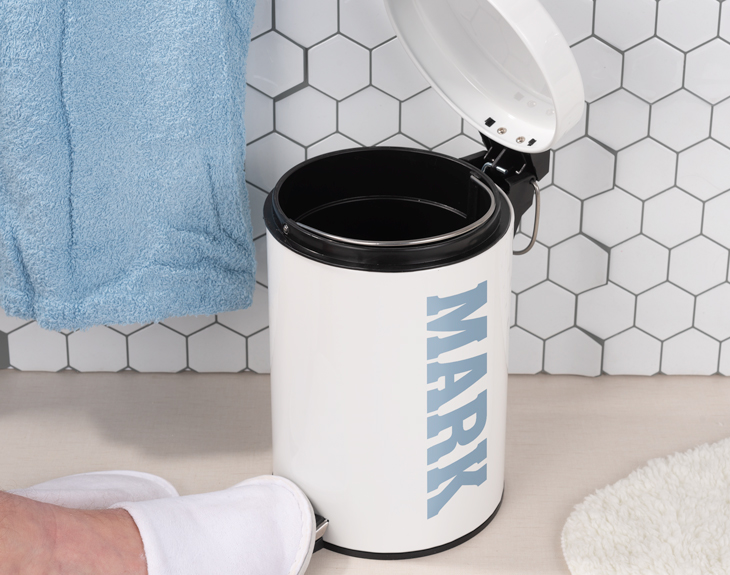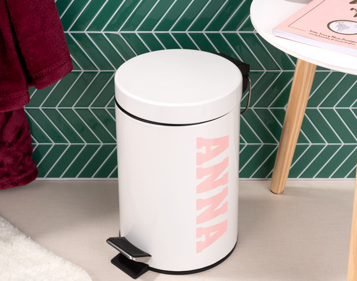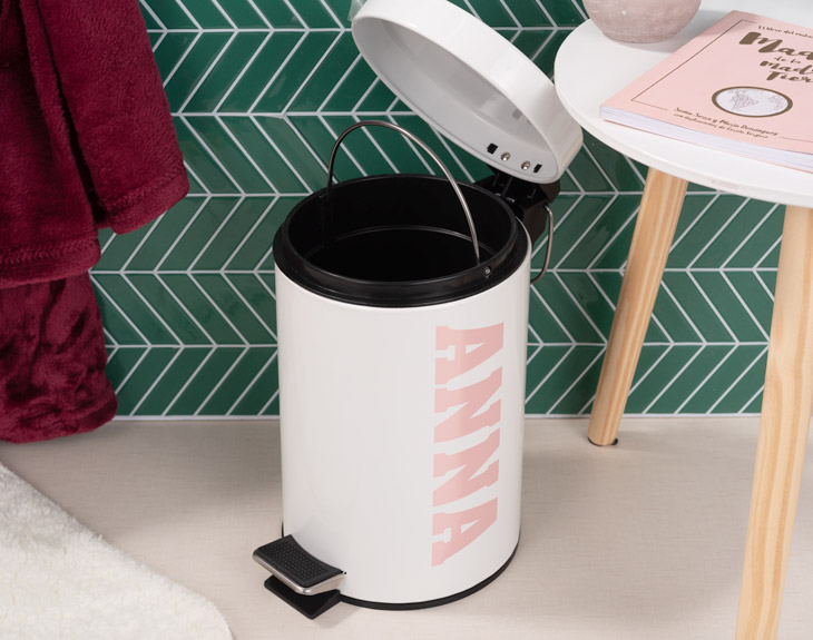 ¿Quieres darle un poquito de color al baño y no sabes cómo hacerlo? Gracias a esta papelera personalizada no solo conseguirás que tu cuarto de baño sea única y muy especial... ¡También te vendrá de perlas para tirar toda la basura de las primeras horas del día! Un cubo de basura de metal con diseño de nombre como este puede ser tu mayor aliado durante la mañana en casa, ya sea para tirar cualquier tipo de papel o para deshacerte del hilo dental. Esta papelera está hecha de metal y cuenta con una altura de 26 centímetros, por lo que podrás colocarlo en el lugar que quieras. ¡Así quedará claro a quién pertenece! ¿Qué mejor forma de empezar en una nueva casa que con un regalo original como este? ¡Será clave para hacer que tu nuevo hogar tenga personalidad! Para personalizarla solo tendrás que entrar en el área de personalización (añadiendo el producto al carrito) y escribir el nombre que quieras en la plantilla. ¡Este aparecerá con el color que quieras y quedará en el lateral de la papelera! Material: metal. Medidas: 26 x 17 centímetros.