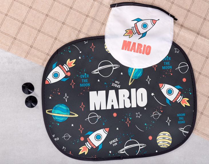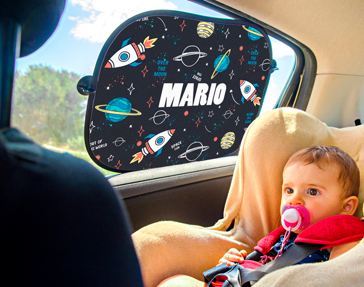¡Convierte cada viaje en coche en una auténtica aventura espacial! Con nuestro parasol lateral para coche, tu hijo o hija estará encantado con los paseos. No solo estará protegido del sol directo, sino que podrá imaginar cómo sería viajar dentro de una auténtica nave espacial. Gracias a su tamaño, se adapta perfectamente a la mayoría de ventanas laterales, manteniendo el interior del coche fresco y protegido. Y lo mejor de este parasol lateral es que es personalizable con el nombre o el texto que tú quieras, convirtiéndolo en un original accesorio para el coche. Incluye un estuche personalizado para guardarlo cuando no lo estés usando y dos ventosas resistentes que lo fijan sin dañar la ventana. ¿Y cómo personalizarlo? ¡Muy fácil! Solo tienes que añadir el producto al carrito y entrar al área de personalización. Allí podrás escribir el nombre de tu peque o un texto breve. Nosotros nos encargaremos de prepararlo para que esté listo en tu próxima aventura sobre ruedas. Protegerás a tus hijos del sol y disfrutarán en familia de cada viaje. Medidas: 37,5 x 45.