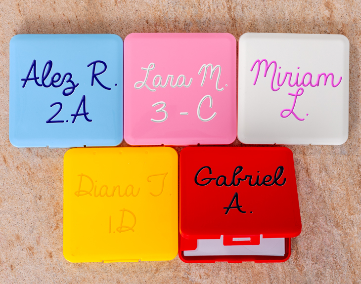 Además, viene con un estuche personalizado ideal para mantener las etiquetas organizadas, protegidas y siempre a mano. En él podrás colocar el nombre del niño o bebé, o el texto corto que quieras, elegir el color de la fuente y combinarlo con el diseño de las etiquetas que hayas elegido. Sin duda, quedará genial.
