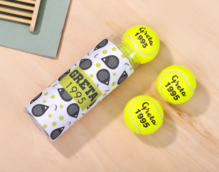 • Pelota de tenis/pádel personalizada . • Tarjeta recordatoria. Importante: no son pelotas de alta competición. Es un producto pensado con fines recreativos y lúdicos.