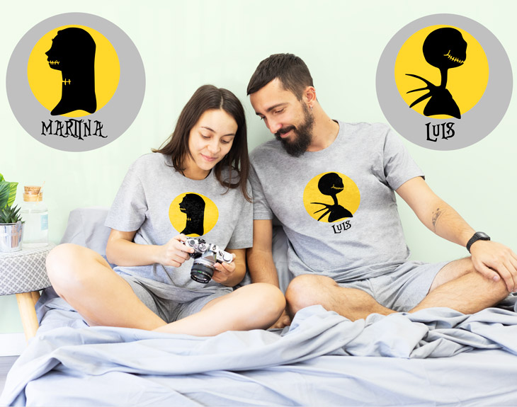 ¿Vuestro amor es una realidad hasta la eternidad como el de los protagonistas de Jack y Sally? Si a pesar de las dificultades habéis luchado muchísimo por vuestra relación, estos pijamas para parejas personalizados tienen vuestros nombres. Además, si entre vuestro top de pelis favoritas está "Pesadilla antes de Navidad", este regalo es perfecto para dar una gran sorpresa a esa persona que te ha robado el corazón. Así podréis ponéroslo y disfrutar cada día de los mejores Puedes escoger entre pijamas de verano, de invierno, de adultos e infantiles. Material: - Camiseta invierno: 100% algodón (excepto color gris: 85% algodón / 15% viscosa). - Camiseta verano: 100% algodón (excepto color gris: 85% algodón / 15% viscosa). - Pantalón invierno: 100% algodón. - Pantalón verano: 100% algodón. Importante: Las medidas son aproximadas, pueden variar 5cm por encima o por debajo. Importante: el tono de los colores puede variar en intensidad según stock