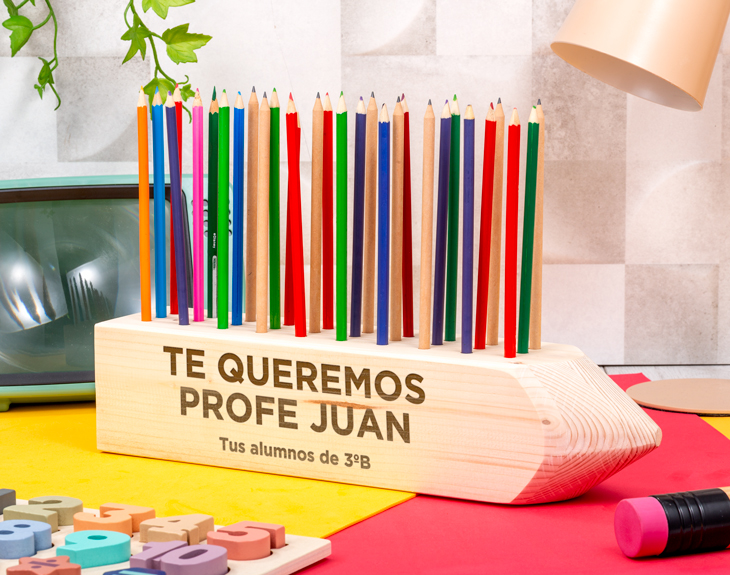 Tu profesor/a tendrá muchos lápices. ¡Pero ninguno como este! ¿Estás buscando ideas para un regalo en fin de curso con el que emocionarle pero también sorprenderle? Déjale con la boca abierta ante este portalápices de madera personalizado. ¡Con un tamaño gigante de 40 centímetros de largo! No podrá dejar de cogerlo y observar su magnitud. Y no solo es un regalo original para profesores que entre por la vista. ¡También es de lo más útil! Con las 30 hendiduras circulares, podrá sujetar de pie varios lapiceros de colores que quedarán muy coloridos y variados. Y para alegrarle aun más, podrás dedicarle a ese maestro/a tan especial el mensaje que quieras en tres líneas. ¡Nosotros lo grabamos sobre la madera! Convierte con tan solo un click este lápiz gigante grabado con hendiduras en tu dedicatoria para profesores más original y especial. ¡En muy poco tiempo podrás tenerlo preparado para despedir a esos maestros especiales como se merecen! Hasta se lo podemos enviar a su casa o colegio directamente. Medidas: 40x9 cm. Número de agujeros: 30. Diámetro de los agujeros: 0,8 cm. Importante: lápices de colores no incluidos.