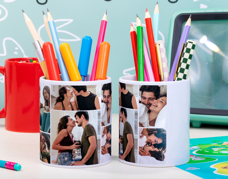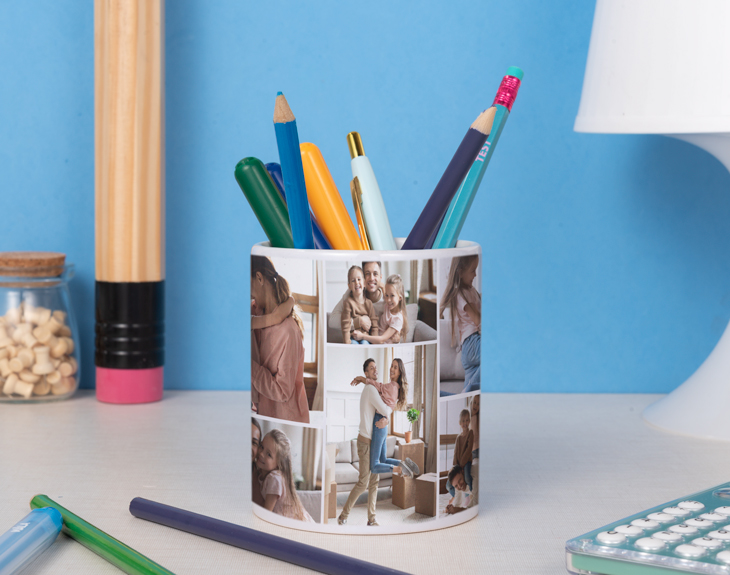 Los días en la oficina se pueden hacer larguísimos. ¿Quieres hacer que los días de tu pareja o de tu ser querido sean un poquito más llevaderos? Este portalápices de cerámica personalizado le vendrá perfecto no solo para guardar todos sus lápices o bolis favoritos... ¡También para rememorar alguno de vuestros mejores momentos juntos! No habrá una mejor forma de decorar su escritorio que con un portalápices con diseño de collage de fotos como este. ¡Todos sus compañeros podrán ver que tiene la mejor familia! Al ser de cerámica resultará de lo más resistente para colocar todo lo necesario para trabajar, y cuenta con una altura de 9,5 centímetros y un diámetro de 8 centímetros. ¡Podrá colocarlo tanto en la oficina como en el despacho de casa! ¿Y cuál es la mejor personalización para este regalo original? Gracias a este collage podrá volver a todos esos instantes que ha pasado junto a sus seres queridos... ¡Le sacará una sonrisa! Encontrarás la plantilla del collage en el interior del diseñador, una vez hayas añadido el producto al carrito. Solo tendrás que clicar sobre cada cuadro de foto para crear el collage mosaico más bonito. ¡Lo podrás ajustar de la forma que quieras! Altura: 9,5 cm Circunferencia: 8 cm.