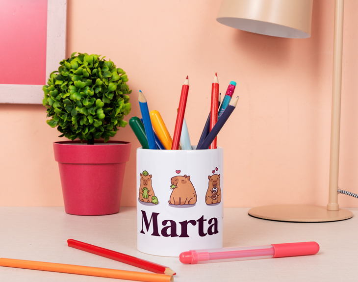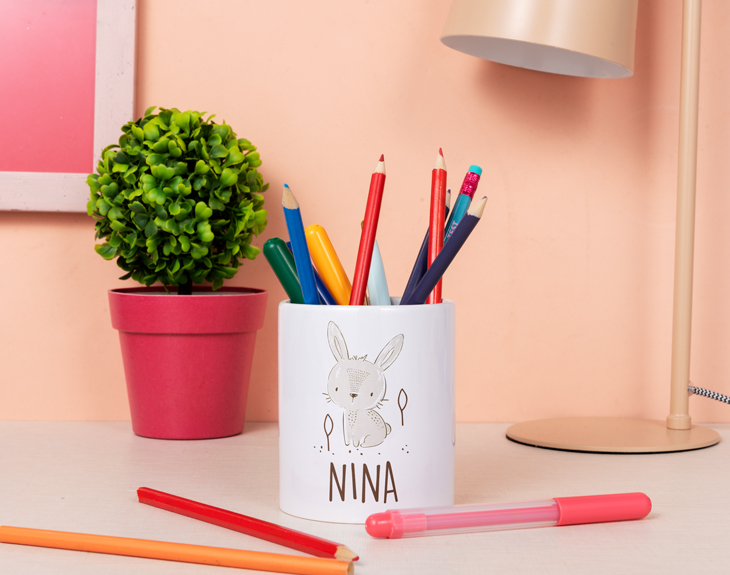 • Portalápices de cerámica personalizado. • Tarjeta recordatoria