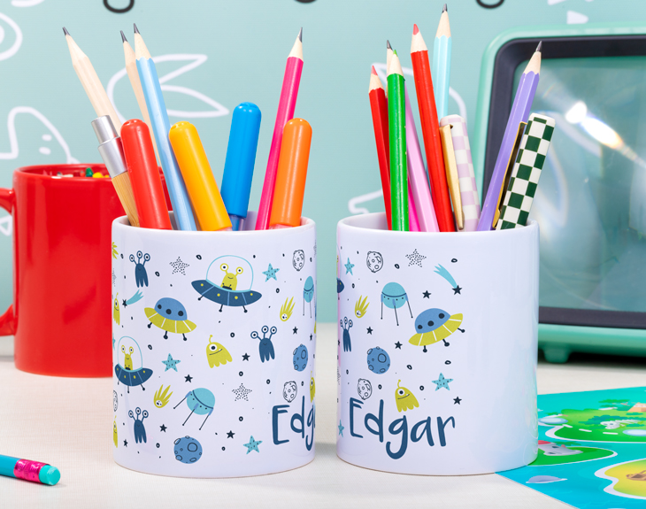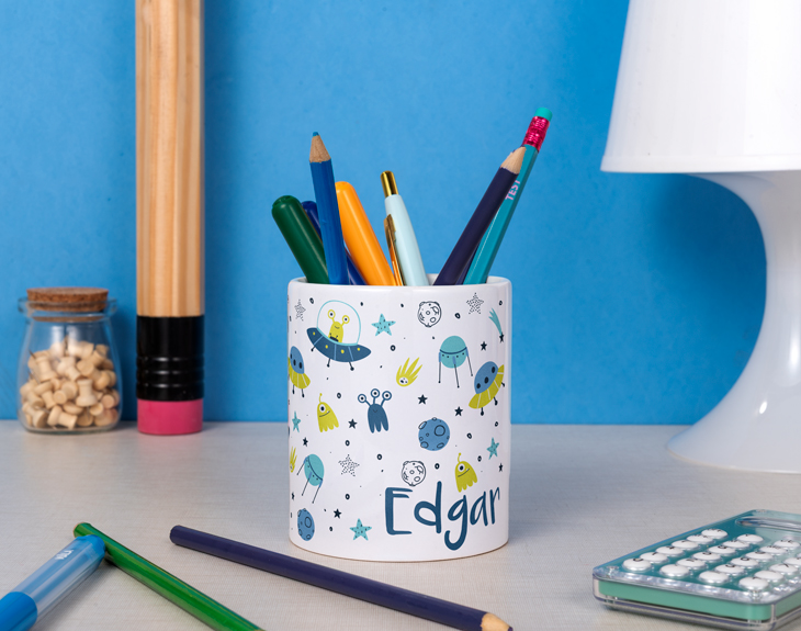 ¿Tu peque es un amante del espacio? Este portalápices de cerámica personalizado con diseño del mundo espacial, marcianitos y naves es la opción perfecta para él o ella. Combina diversión, color y fantasía galáctica. Además, es el regalo original para la vuelta al cole que le encantará y hará que cada día de estudio sea mucho más divertido. Perfecto para darle vida a su escritorio mientras ayuda a organizar material escolar como lápices y rotuladores. Este portalápices para niños, con un diseño lleno de planetas, naves y marcianitos divertidos, convierte el aprendizaje en una auténtica aventura espacial. Lo mejor es que puedes personalizarlo con su nombre, transformándolo en un detalle único, práctico y lleno de magia. Para personalizarlo no tardarás nada, solo tienes que añadir el producto al carrito, escribir el nombre que quieras y tendrás un regalo lleno de fantasía espacial, listo para acompañar a tu peque en todas sus aventuras. Altura: 9,5 cm Diámetro: 8 cm