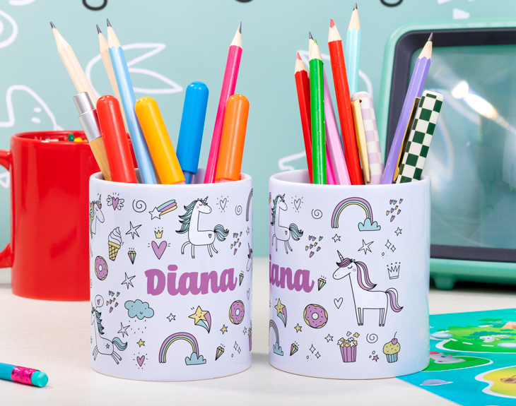 ¿Quieres tener un detalle con tu peque que sea tan mágico como inolvidable? Este portalápices de cerámica personalizado con diseño de unicornios es justo lo que buscas. Es perfecto para sorprenderle con un regalo lleno de color, fantasía e ilusión. Ideal para decorar su escritorio, dar un toque especial a su habitación y organizar todos sus lápices y rotuladores favoritos. También es una opción ideal como regalo de vuelta al cole para algún niño o niña de la familia, un vecinito del barrio o un amiguito del cole. Su diseño de unicornios fantásticos, alegre y colorido, les encantará. Además, podrás personalizarlo con el nombre que desees, convirtiéndolo en un acierto seguro, un obsequio lleno de magia. Este portalápices original no solo es precioso, sino también muy práctico para el día a día, sobre todo a la hora de hacer los deberes o mantener el escritorio ordenado. Personalizarlo es súper sencillo, solo tienes que añadir el producto al carrito, escribir el nombre que quieras y listo tendrás un portalápices práctico, bonito, duradero y, por supuesto, lleno de fantasía. Altura: 9,5 cm Diámetro: 8 cm