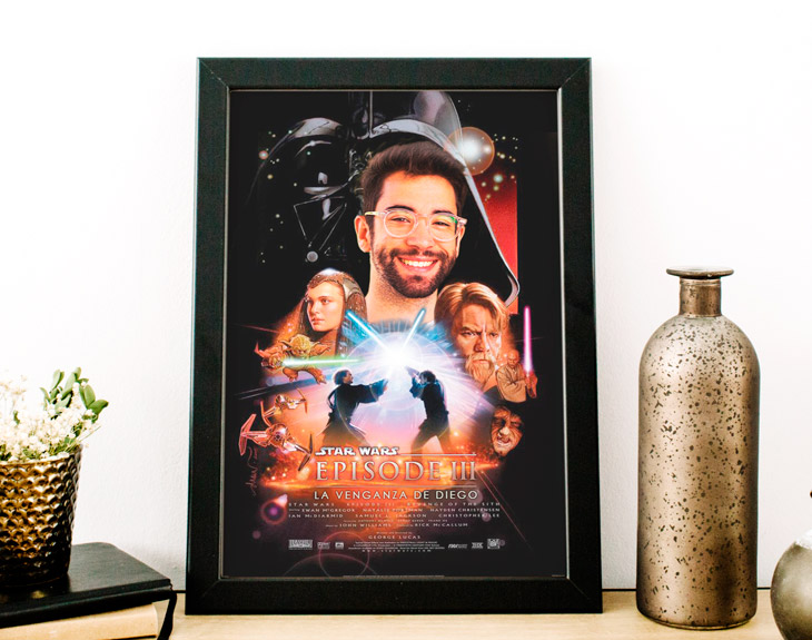 En una galaxia muy, muy cercana, Anakin Skywalker no es el protagonista de la saga Star Wars. ¡Lo eres tú! O cualquier amigo friki al que quieras sorprender con su propio poster de cine personalizado. Si tú también admiráis el tono oscuro y trágico del episodio III, ahora puedes unirte a Obi Wan Kenobi y Padmé Amidala justo en el centro del cartel. Si fueras a convertirte en Darth Vader, ¿qué cara tendrías? Envíanos tu mejor foto jedi donde se te vea bien claro y separado el rostro, y nosotros te haremos protagonizar 'La Venganza de los Sith'. Y para que sea un auténtico regalo original para los más cinéfilos, podrás sentirte como George Lucas escogiendo el subtítulo del film. ¡Escribe el texto que quieras bajo el número del episodio! Siéntete rodeado de estrellas y personaliza este galáctico cártel de película con tu foto y tu nombre, para estar junto a Ewan McGregor y Natalie Portman. Decora tu pared más grande con el tamaño gigante en papel póster o cuélgalo con el marco incluido sobre el tamaño A4. Recomendaciones para tu foto: -La imagen deberá ser lo más clara y nítida posible con bastante luz, ya que se recortará exactamente de la que se adjunte. -La persona no deberá aparecer muy alejada, con una altura mínima de medio cuerpo (este es el tamaño con el que aparecerá en el producto). -Recomendamos que aparezca la persona sobre un fondo lo más uniforme posible, y sin agarrarse a otras personas. Que se le vean todas las facciones del medio cuerpo. Importante: El color del marco puede variar según stock.