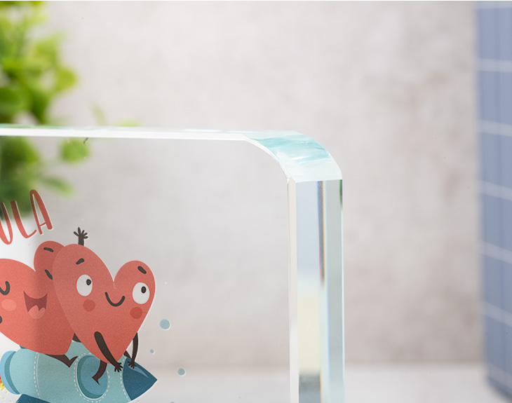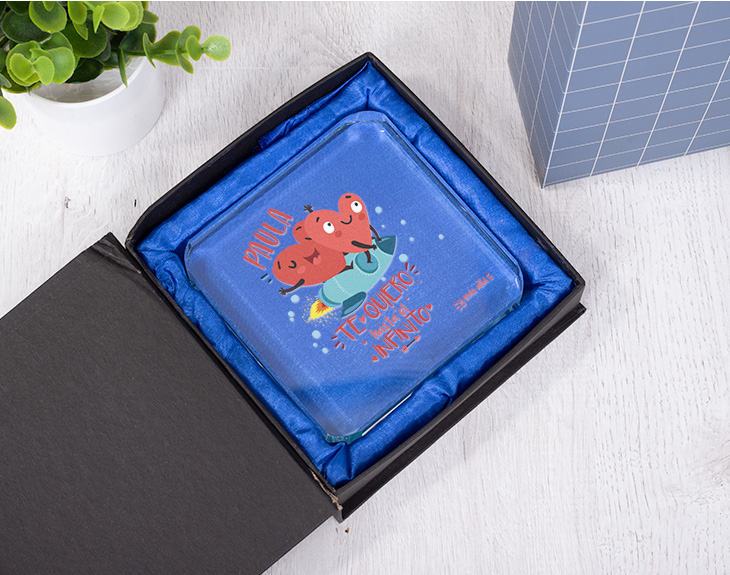 ¿Qué mejor forma de decirle te quiero a ese alguien especial que con un regalo que no podrá olvidar durante el resto de su vida? Este prisma de cristal personalizado está hecho para que tu pareja, tu madre, o cualquier ser querido sepa que le quieres hasta el infinito... ¡Y más allá incluso! Uno puede declarar su amor a una persona de mil maneras distintas, pero ninguna de ellas será tan útil como con este prisma de cristal con diseño de corazones. Este cuadrado tiene una medida de 9,5 centímetros en cada uno de sus lados, por lo que quedará de lujo en cualquier rincón, ya sea en la estantería del salón o en el escritorio del despacho. ¡Viene en un pequeño estuche de color negro! Si irías hasta los confines del mundo con esa persona a la que quieres tanto, este regalo original está hecho para él. ¿Lo mejor? ¡Podrás personalizarlo con el nombre de tu otra mitad! Entra en el diseñador para poder personalizar el producto con el nombre que quieras. ¡Solo tendrás que escribirlo en el cuadro de texto! Medidas del prisma cuadrado: 9,5 x 1,5 centímetros. Medidas de la caja: 13,5 x 12,5 centímetros. Material: cristal.
