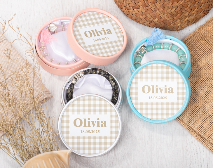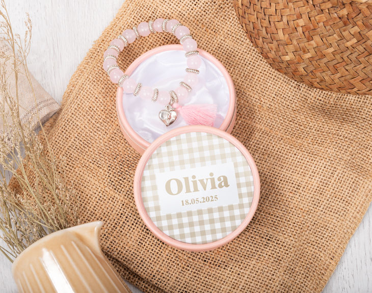 La Primera Comunión de tu hijo/a es el momento perfecto para sorprender a tus invitados con un precioso detalle. Estas pulseras con cajita personalizada dejarán sin palabras a tu familia y amigos en esta ocasión tan especial y son la forma perfecta para agradecerles que pasen este día con vosotros. ¡Les encantará! Una celebración así merece que todos los detalles sean perfectos y que además sirvan para que nadie olvide este día. Por eso, estas originales pulseras son perfectas para tus invitados. Además, vas a poder elegir el modelo y color de pulsera que más te guste (rosa, azul o negro) y también si quieres grabar la chapita que va colgada en la pulsera. ¡Será totalmente personalizable! Para terminar, no te olvides de personalizar estas pulseras y su cajita para que este detalle sea único. Elige cuántas unidades quieres, añádelas al carrito y comienza a personalizarlas. Solo tienes que añadir el texto que quieras junto a este diseño de cuadritos Vichy y estará listo. ¡No habrá regalo mejor para comuniones! Medidas aproximadas de la pulsera: 25 cm de largo.