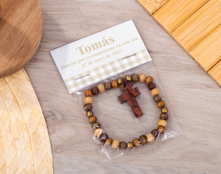 Organizar la celebración de la Primera Comunión de tu hijo o hija no es una tarea sencilla. Son muchos los detalles que debes tener en cuenta para que todo salga perfecto en ese gran día. Y, sin duda, el evento no sería lo mismo sin los invitados que compartirán este momento tan importante. Por eso, si deseas agradecerles su presencia de una manera especial, tenemos el recuerdo perfecto para ti. Te presentamos nuestra pulsera cruz de madera en bolsita personalizada, un detalle original para que todos recuerden con cariño y emoción la Primera Comunión de tu peque. Podrás personalizar el cartoncito de la bolsita con el texto que prefieras: el nombre, el lugar y la fecha de la celebración, o incluso un mensaje breve que quieras dedicar. ¡Quedará excelente! Esta pulsera no solo es una forma de compartir tu fe con los invitados, sino también un elegante y original accesorio que podrán llevar consigo a todas partes. Añade la cantidad que necesites al carrito y entra al área de personalización. Allí podrás escribir el texto que desees, y nosotros nos encargaremos de que quede perfecto. ¡Pronto tendrás un recuerdo original para sorprender a todos tus invitados!