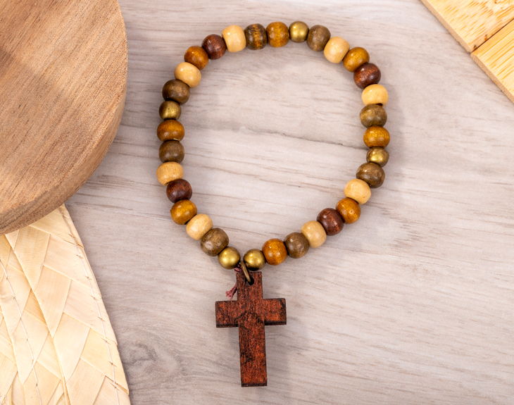 • Pulsera cruz de madera en bolsita personalizada. • Tarjeta Recordatoria.