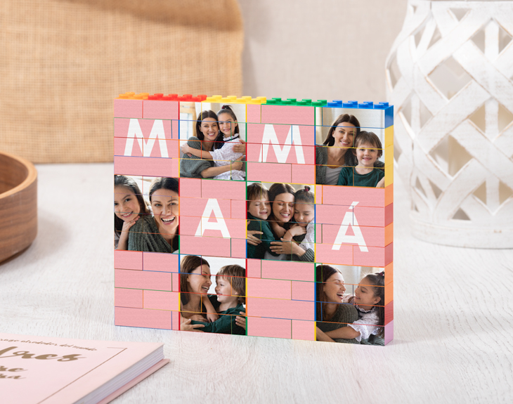 Si ha habido un juguete que ha unido a varias generaciones, serían los juegos de construcción tipo Lego. Si tu madre ha pasado o pasa horas jugando contigo a este divertido juego, seguro que le hará especial ilusión que la sorprendas con nuestro innovador puzzle de bloques personalizado Mosaico de mamá. ¡Una forma de lo más original y tierna de adornar vuestro hogar! Este juego de piezas de construcción seguro que le traerá entrañables recuerdos, al fin y al cabo ¿quién no ha pasado horas jugando a este clásico? Si a ello le sumamos su original diseño, personalizado con vuestras mejores fotos y la palabra “MAMÁ”, seguro que daremos en el clavo. Estas divertidas piezas son totalmente compatibles con piezas de Lego y nos permiten un montón de posibilidades, desde jugar con ellas hasta utilizarlas como decoración de un espacio especial, ¡seguro que queda genial decorando su mesita de noche! Si buscas un detalle para sorprenderla en su cumpleaños o estás pensando en un regalo original para el día de la Madre, nuestro puzzle de bloques será una opción tan divertida como emotiva. Escoge las mejores fotos y prepárate para ver cómo se emociona con vuestros mejores recuerdos, ¡seguro que será un exitazo! Medidas: 14 x 11,5 x 1,5cm El color y tamaño de las piezas varían según stock. Importante: la edad recomendada para jugar con estas piezas es a partir de 3 años. Importante: Este puzzle tiene fines decorativos. Para mantener su apariencia y durabilidad, te recomendamos no desmontarlo.