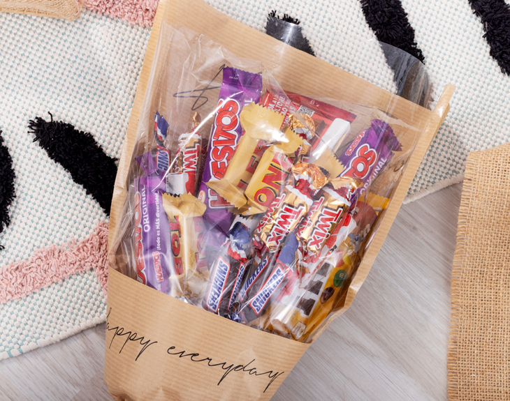 • Ramo de veinticinco chocolatinas. • Corazón de madera personalizado. • Tarjeta Recordatoria.