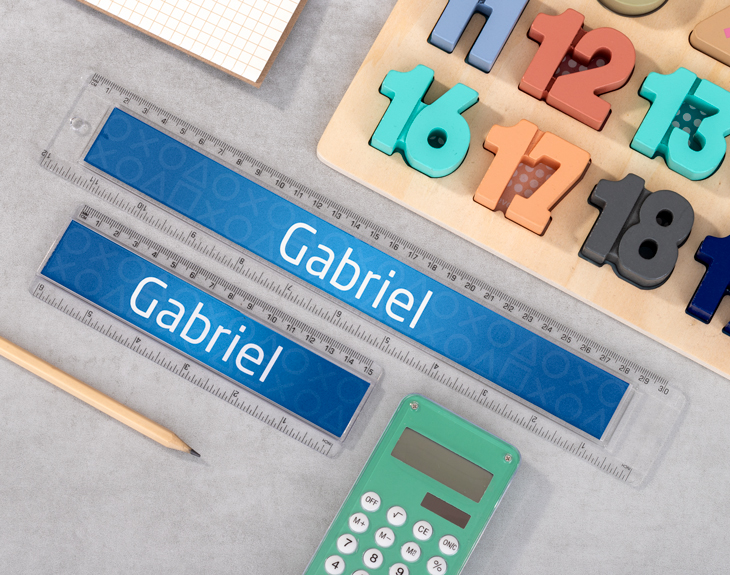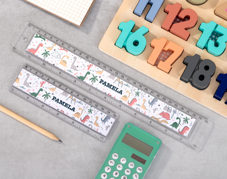 ¿Tu peque es fan de los dinosaurios y no se cansa de imaginar aventuras prehistóricas llenas de color? Entonces este pack de reglas escolares personalizadas es perfecto para él o ella. Con un diseño alegre y lleno de dinosaurios de colores, este dúo de reglas convertirá cada día de clase en una auténtica expedición jurásica llena de creatividad. Este set ha sido diseñado para hacer más fácil y divertido el día a día en el colegio. Incluye una regla escolar de 30 cm, ideal para trabajos técnicos o actividades de geometría, y una regla escolar de 15 cm, perfecta para tener siempre a mano en el estuche o la mochila. Gracias a la opción de personalización con el nombre del niño o la niña, se garantiza una mayor organización y se evitan pérdidas o confusiones en el aula. Personalizar este pack es muy sencillo: solo tienes que añadir el producto al carrito, acceder a nuestro diseñador y escribir el nombre que desees en cada campo de texto. Puedes poner el mismo nombre en ambas reglas o modificarlas para que sean diferentes. Haz clic en el texto, cambia lo que quieras y acepta. Luego, elige si quieres personalizar solo una regla o ambas. Tú decides. Y listo, tendrás un pack de reglas transparentes que hará que medir, subrayar o dibujar sea mucho más divertido. Convierte la vuelta al cole en una aventura entre dinosaurios y que empiece la diversión. Medidas: Grande: 31 x 5 cm Pequeña: 16 x 4,7 cm Material: plástico transparente.